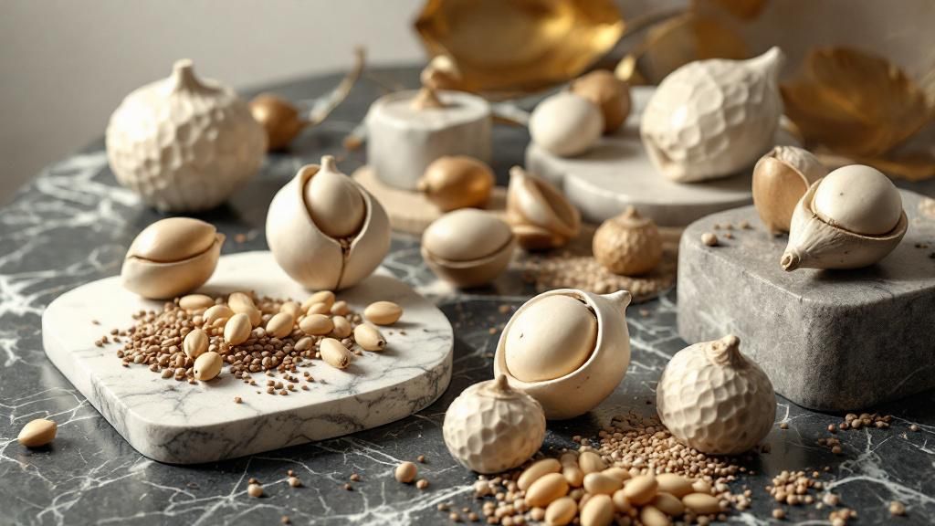 • Ceramic cocoa pods and bronze magnolia seeds convey narratives with directness and confidence